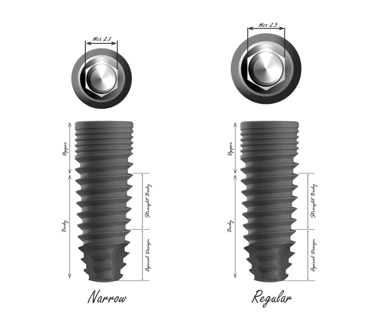 A medida que la longitud del implante aumenta, el cuerpo recto también se alarga. Por esta razón, los implantes largos pueden colocarse de manera estable sin causar cambios inesperados en el momento de la cirugía, al igual que los implantes de tipo recto.
